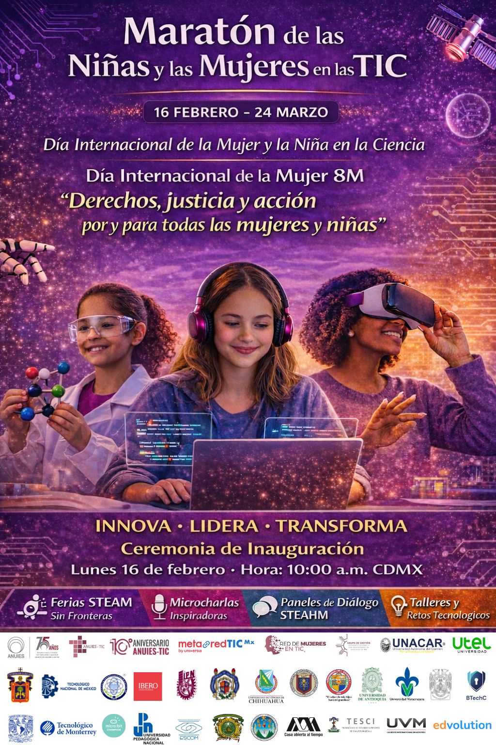 El Maratón de las Niñas y las Mujeres en las TIC se estructura en cinco capítulos estratégicos que reflejan la capacidad de articulación, colaboración y liderazgo de la Red de Mujeres en TIC de la ANUIES-TIC, en coordinación con universidades, organismos académicos y aliados nacionales. Este modelo colaborativo fortalece el ecosistema STEAM en México al integrar esfuerzos interinstitucionales, compartir buenas prácticas y generar acciones coordinadas de alto impacto. Capítulo 1. Ferias Híbridas “STEAM sin Fronteras” Capítulo 2. Microcharlas “Mujeres y Niñas en Ciencia y Tecnología: Liderazgo con Propósito…
